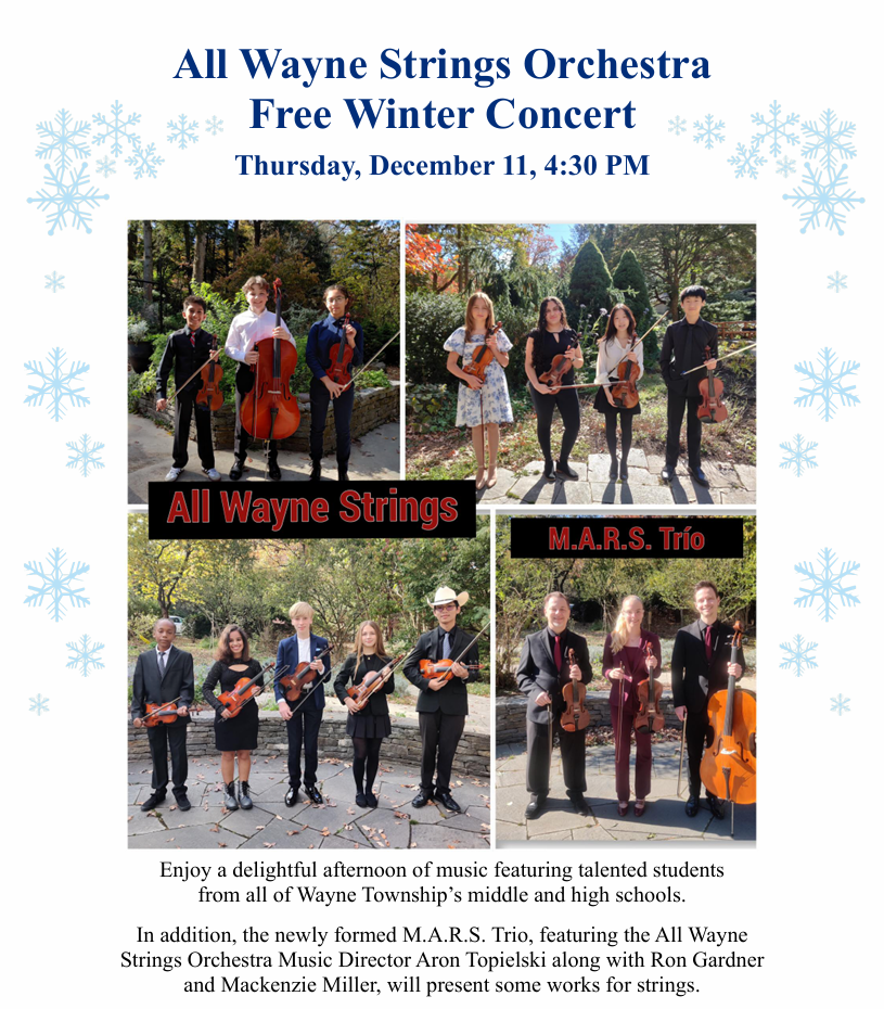The All Wayne String Orchestra invites the community to enjoy an afternoon of festive holiday and winter music on Thursday, December 11 at 4:30 PM at the Knippenberg Center for Education at Laurelwood Arboretum, 725 Pines Lake Drive West in Wayne. The program will also showcase the newly formed M.A.R.S. Trio, with the orchestra’s music […]