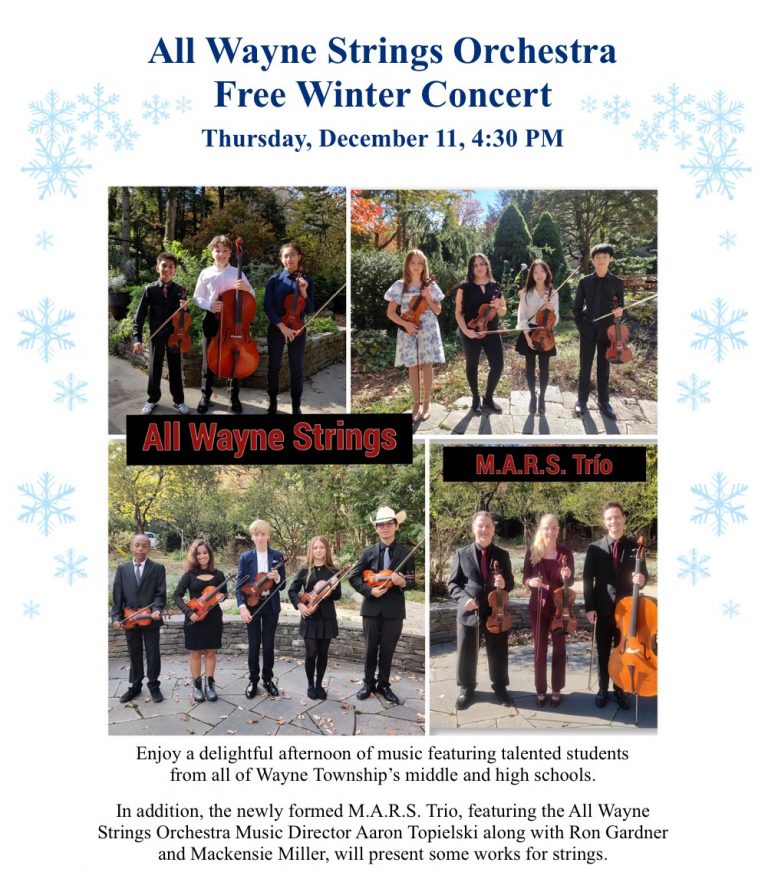 Date Dec 11 2025 Time 4:30 pm - 5:30 pm All Wayne String Orchestra – Winter Concert Share this event + Add to Google Calendar + iCal / Outlook export
